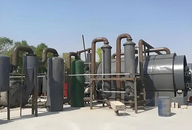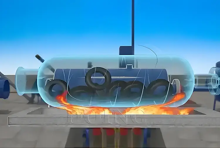 Processo de pirólise : aquecimento em um ambiente deficiente em oxigênio (400-500 ° C) decompõe a borracha em uma mistura de gás de óleo, que condensa a produzir óleo combustível; O fio de aço e o preto de carbono foram reciclados através da separação física. Medidas de proteção ambiental :